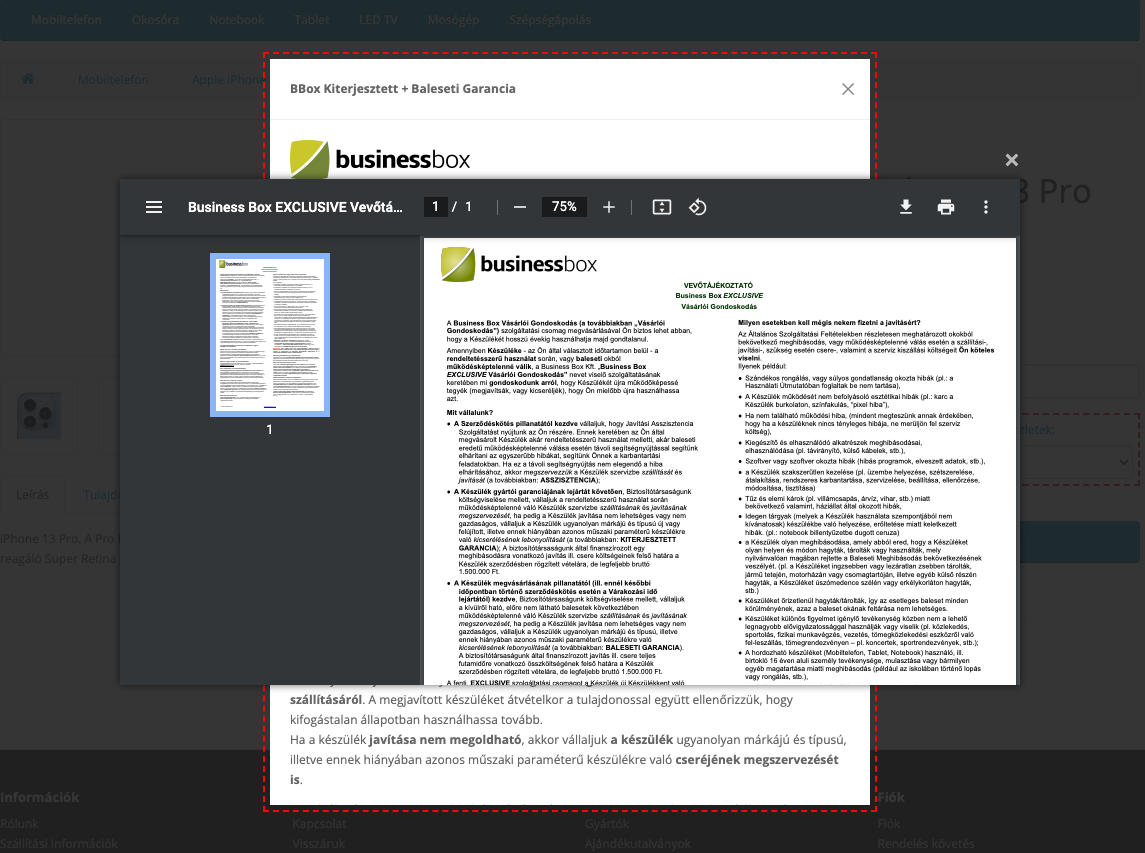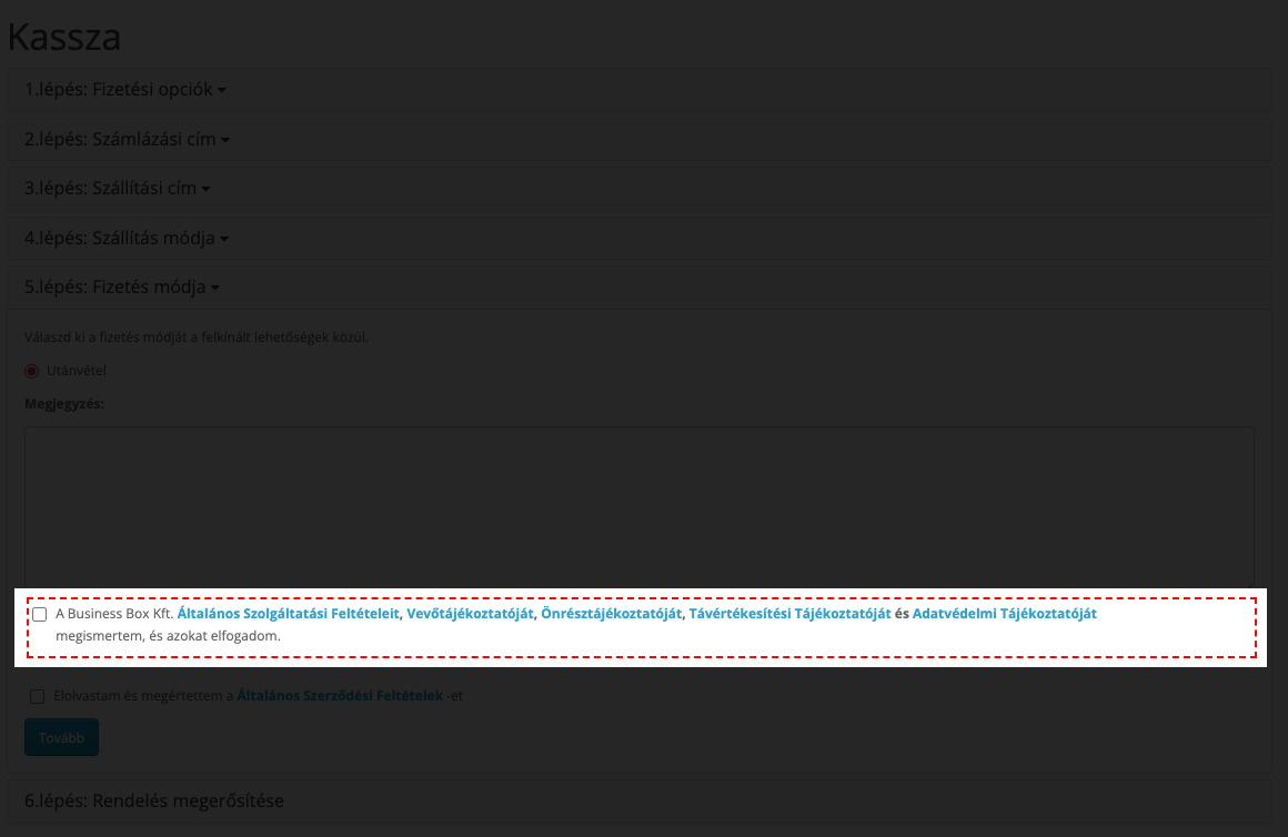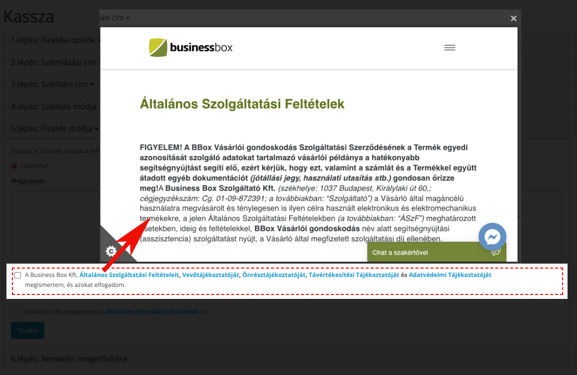 A fizetés előtt - ha van a kosárban BBox kiterjesztett garancia termék - el kell fogadnia a vásárlónak a BBox ASZF-et és a kapcsolódó tájékoztatókat. Ahhoz, hogy ezeket megismerje, az API visszaadja a megfelelő szöveget, amiben linkelve vannak a kapcsolódó dokumentumok. Ezeket javasolt szintén felugró ablakban megnyitni. Az elfogadás tényét a Business Box rendszernek is rögzítenie kell, erre külön API hívás is van (acceptTermsAndConditions). Ha elfogadta az ASZF-et és megismerte a tájékoztatók tartalmát, akkor a bolti fizetési folyamat lezárása után rögzíteni is kell az a kosárba rakott szerződés(eke)t!