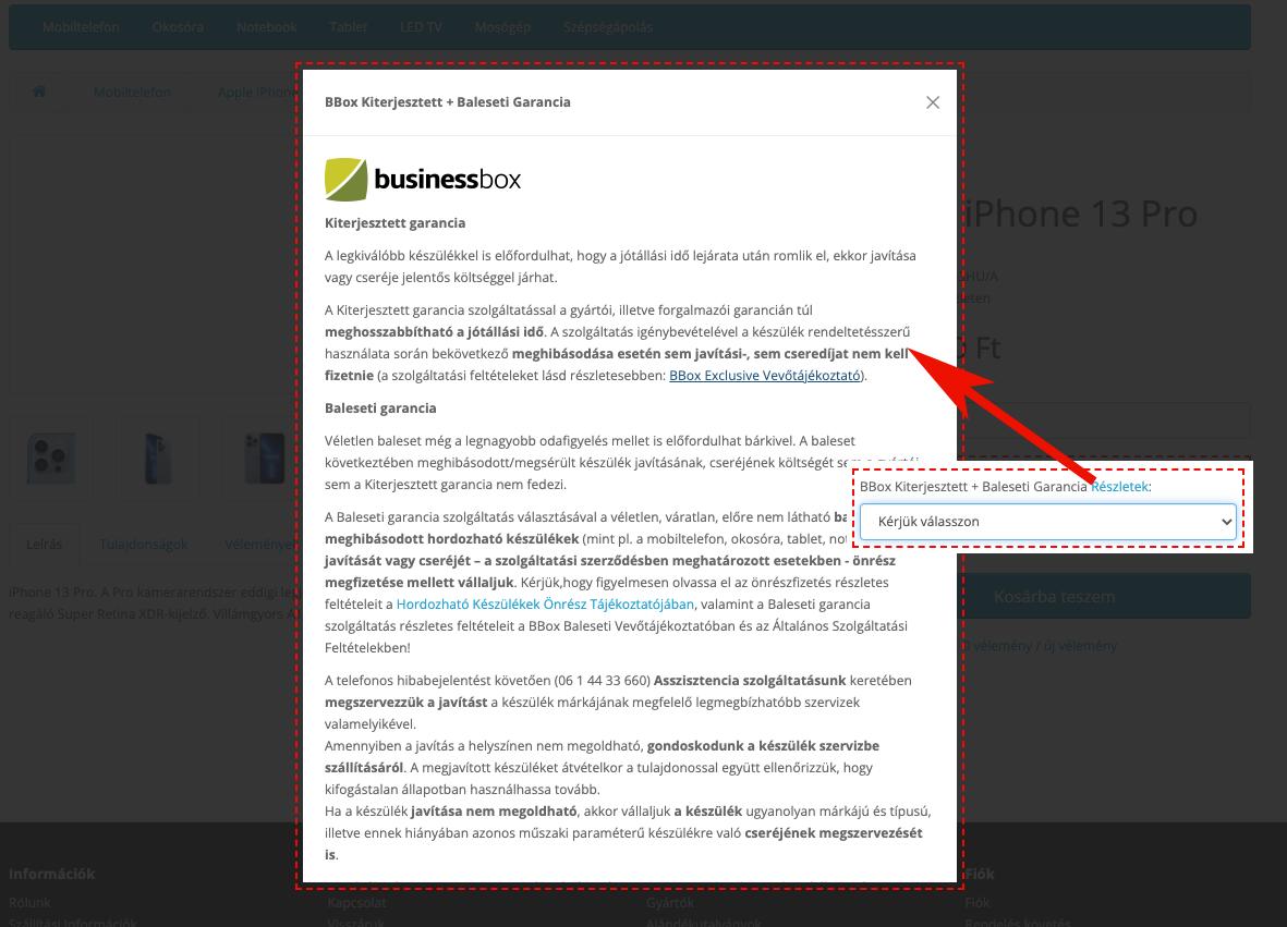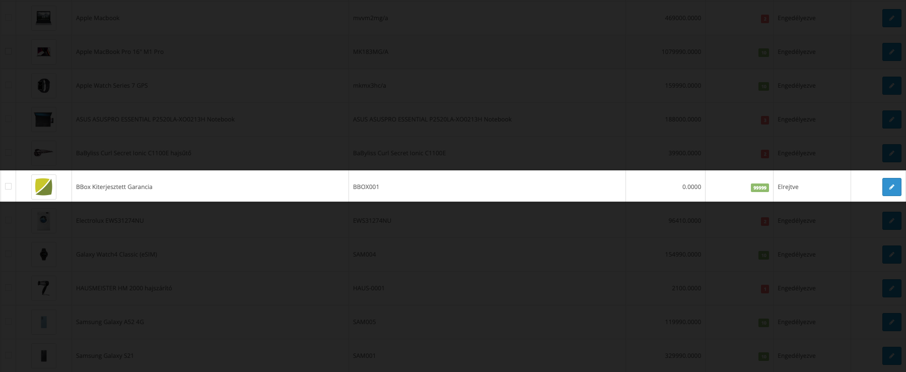 A webáruház árukészletébe fel kell venni a BBox Kiterjesztett Garancia szolgáltatást, mint