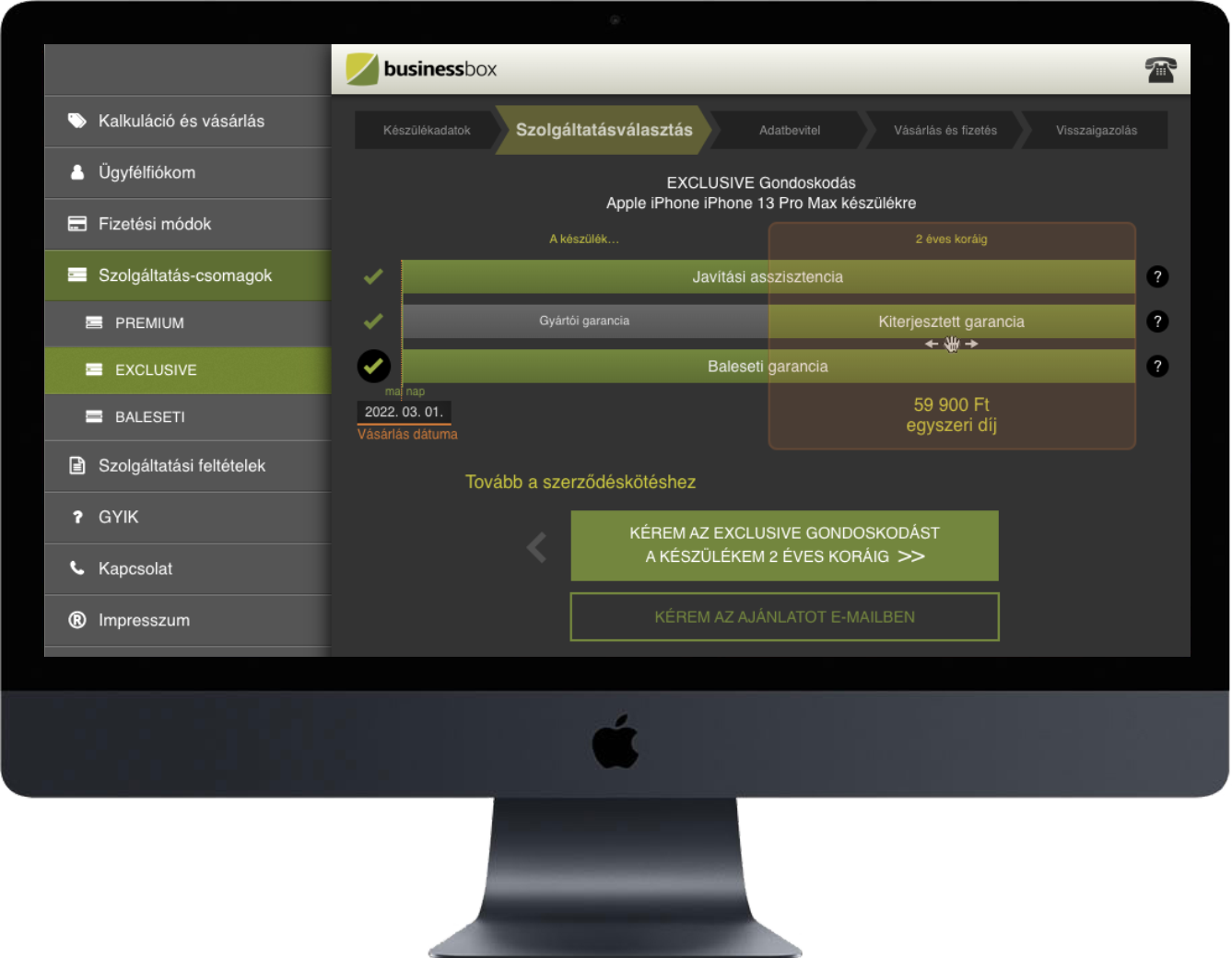 Webáruházad vásárlója a készülék kiválasztásával egy időben kosárba tudja tenni a Vásárlói gondoskodás szolgáltatásunkat is. A készülék és a szolgáltatás megrendelését követően egy inaktív szerződést hozunk létre, amelyet emailben elküldünk a vásárlónak.